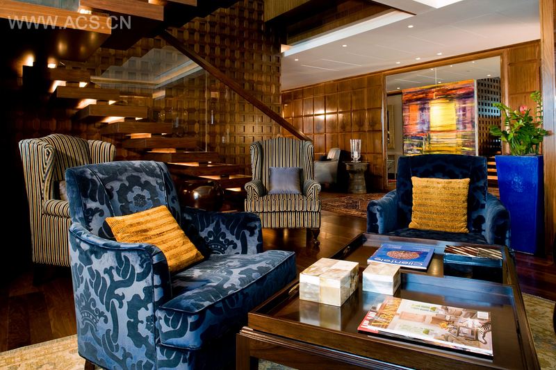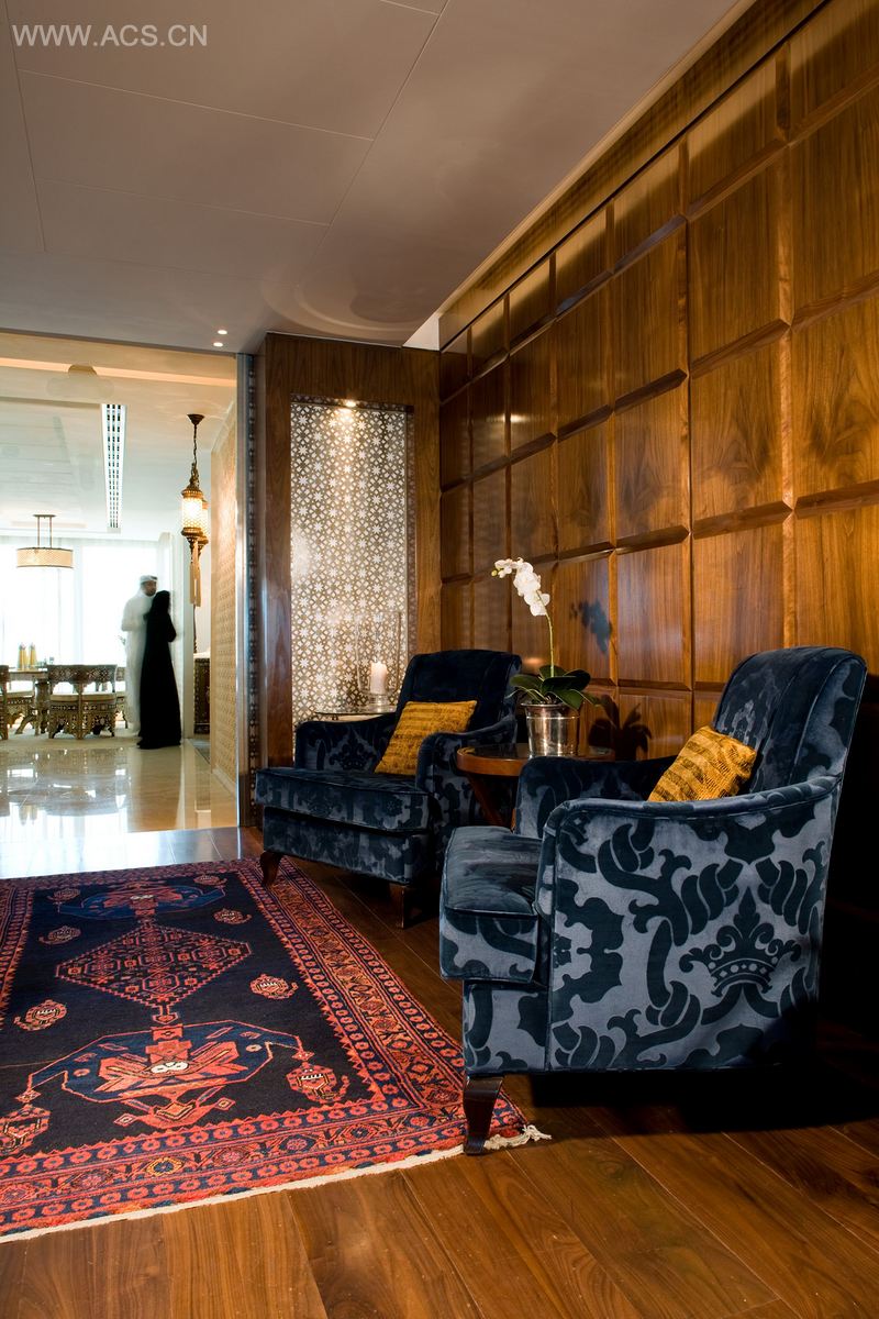 在Al Hamra用餐空间中,长长的果汁吧成为空间的焦点。吧台散发出各种蓝色及品红色的光,突出了天花板上从土耳其特别定制制作的照明装置。墙面上有纹理的石头机装饰的黄铜色照明装置突出了阿拉伯的主题和色调。这是一个现代的空间,拥有时尚明亮的外观。
