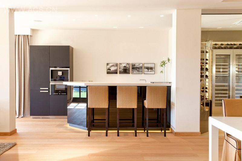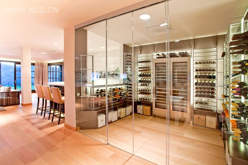 该项目由尼古拉斯·邓恩负责,他曾改造过位于La Zagaleta的豪宅,这是马贝拉最好的住宅区之一。这座别墅之后会在当地的独家房地产市场被出售。这座明亮且极具吸引力的酒窖通过营造一种和谐氛围,再完美结合其他装饰,达成了目标。酒窖可以存放和展示所有不同样式的酒瓶,有六瓶装和十二瓶装。它们都是被摆放在方形的钻石酒架上。此外, 简易的喷漆钢管被制作“U”型,与木制家具一起,摆在较低层的位置用来存放较大号的酒瓶和酒盒,增加了酒窖的功能性。此空间完美平衡了技术与审美的需求,既确保了红酒的安全,又使它们摆放地井然有序。为了使酒窖的功能性更加突出,此项目还需要两个用来储藏白酒和气泡酒的冷藏酒柜。这些装置只有通过将隔壁杂物间产出的热量排出,才能够有效地安装。该酒窖项目为了赶上客户给的最后期限,在最短的时间内完成了任务。