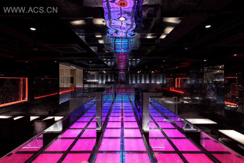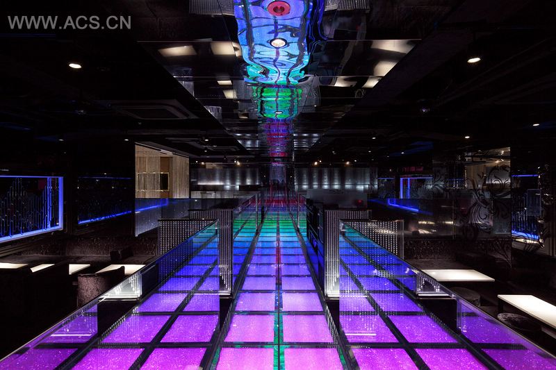 本案室内空间华丽,闪闪发光,富有魅力。闪耀的水晶点缀在黑色基调的空间中。不断变幻色彩的LED,给空间带来无穷的变化。流过玻璃的水流,闪烁的水晶创造出清凉的空间印象。
