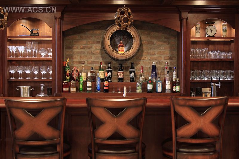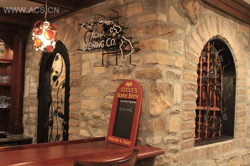 该地窖翻新计划包含了一座带有双筒砖顶石酒窖和配套的定制铁门和窗户。酒窖内有一个保湿器、开放式储物架和未完工的红木酒架。酒窖旁边是一个定制的小吧台,它的红木酒吧柜增强了视觉效果,并与花岗岩桌面、木制吧台、砖墙背景相协调。定制的LED灯照着波旁威士忌酒桶顶部,仿佛一个展示柜。酒窖可通过远程控制将吊灯、罐灯、下柜灯以及LED灯相结合,为酒吧营造了完美的环境。木板条花纹的瓷砖和方格天花板造就了酒窖整体的宏伟感。