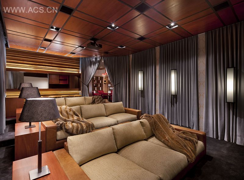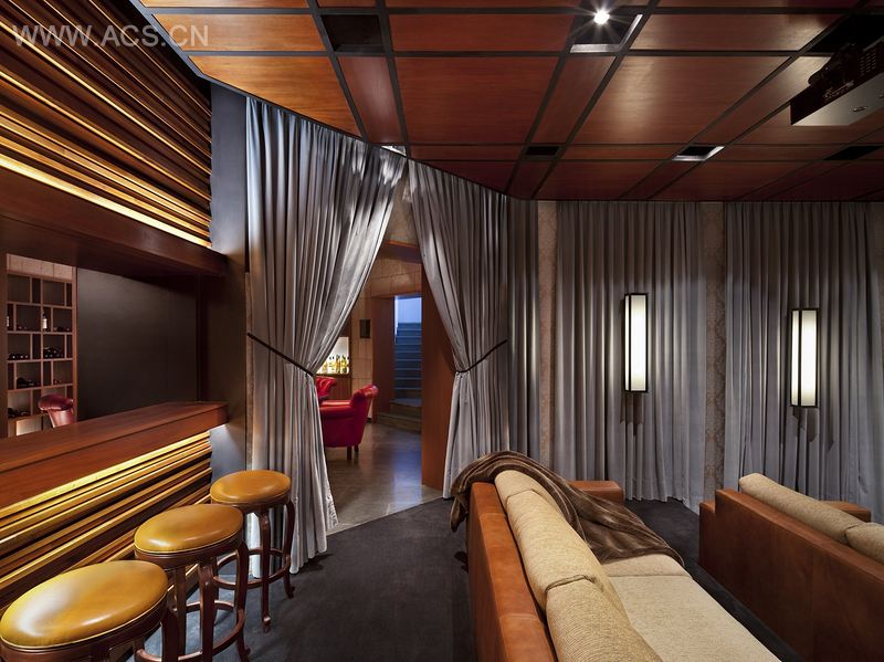 这栋楼的较高楼层为私人区域,主卧室便在此。进入这儿会经过一个大厅,紧接着是一个小客厅,然后再进入卧室。这一楼层还有其他三个卧室。另一楼层的地下室有着电影院,内有皮革绒沙发和酒吧。进入房间要经过非常吸引眼球的座位区,座位区内设有酒窖,里面有六张红皮椅子。该区域还包含了厨房和盥洗室。其照明主要依靠吊灯的红色灯影和烛光,产生更梦幻的视觉效果,并营造出更温暖的氛围。