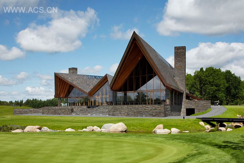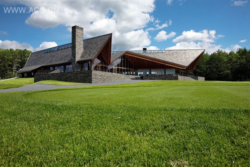 本案的建筑旨在弥合传统美式高尔夫会所和斯堪的纳维亚的功能性建筑之间的差别。这个高尔夫会所是传统的翼型建筑,但却是用纯朴的材料制成,拥有大型的悬臂和斜角。屋顶漂浮着仿佛与多山的景观、树冠和天上的云朵结合在一起成为雕塑般的元素。