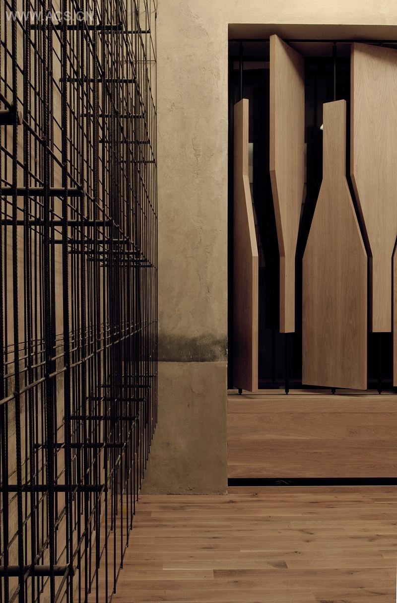 该项目旨在为客户享受此时此刻的美酒和美食提供一个绝佳的场所。高质量的工艺材料直接关系到葡萄酒的生产,餐厅的地板和吧台都是采用橡木制作,酒架则是用钢筋条制成,过程类似于在葡萄园中支撑葡萄茎。