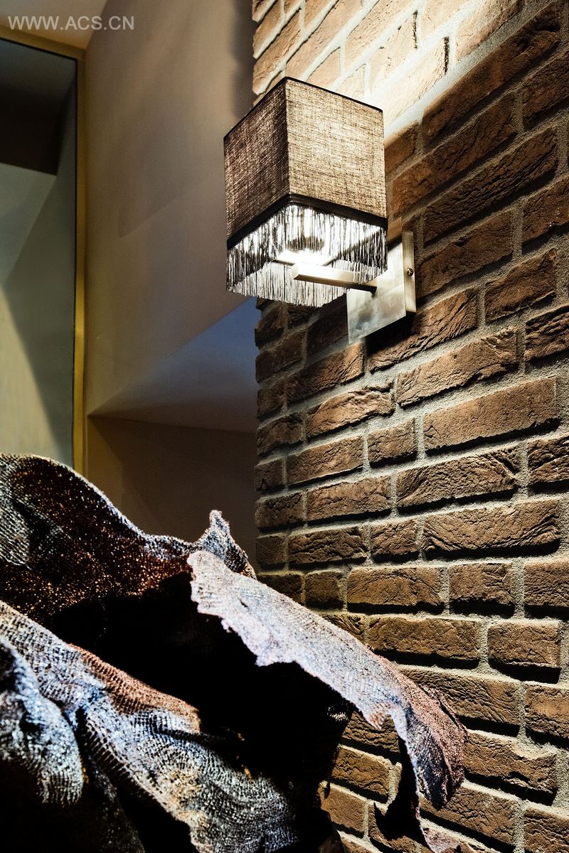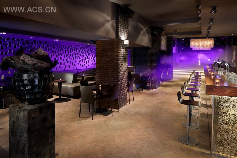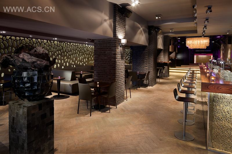 柱子上覆盖了巧克力色的砖头,啤酒架用光泽的桑托斯木制成,架子腿用LED照明。创造出有质感的照明,放大了砖头和光泽的架子腿之间的对比。香槟色的有机墙面可以被照明成各种颜色。巨大的吊灯由梅拉诺玻璃制成。这是一间奢华的绅士俱乐部。