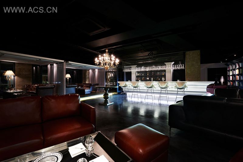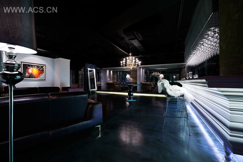 大厅沐浴在吊灯散发出的温暖灯光下,深灰色的树脂地板充满男性气概。浪漫的灯光反射在玻璃酒瓶上,洒向白色的桌面,展现了隐藏的内在的柔软。