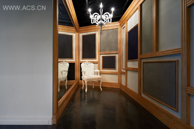 在进入大厅前,还要经过一个等待室。柳安木和白蜡木框架勾画出一栋典型的英式宅邸,超大尺寸的镜子让小空间显得更加宏伟。从适宜的家具到明亮的灯光,客人们能感受到查尔斯的爱好。