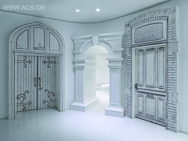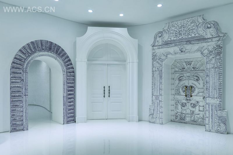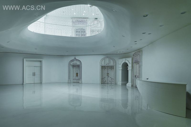 Noiz决定将空间布局进行重新规划,使用尽可能灵活的自由形态以配合现有结构和设计过程中设计要求的变更。为了与建筑外部及周围环境的繁华热闹形成对比,设计师决定在室内尽量少的使用色彩,让一切保持白色,以减轻其分量感及室外的“繁华热闹感”。在这种纯白的色调中,应用了各种各样的材料和纹理来诠释空间的差异性和氛围。每个空间都有独特的形状,在纯白的色调中体现了不同的质感。设计师精心应用了多重材料在各种表层如地板、墙面、天花板、家具上,并使其协调一致并与各个空间不同的尺寸和功能相搭配。最大的空间是主厅,拥有两层楼高的中庭,被用作接待区和活动空间。Noiz将下层的天花板表层处理成倒置的景观,连续不断地涌向最中间的开口处,如同高尔夫球洞,故意地穿透其粗糙表层。独特的LED吊灯悬挂在上层天花板上,将光线洒向下部空间。设计师还应用了一系列历史及现代风格的图画作为门道,这种设计贯穿整个空间,涵盖东方及西方风格,在整体空间中建立视觉焦点。这些图画被故意处理成“虚假”的信息,随机混合成2D和3D的形式,带来了材料和信息以及真实和虚假之间的独特体验。