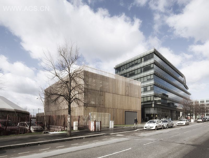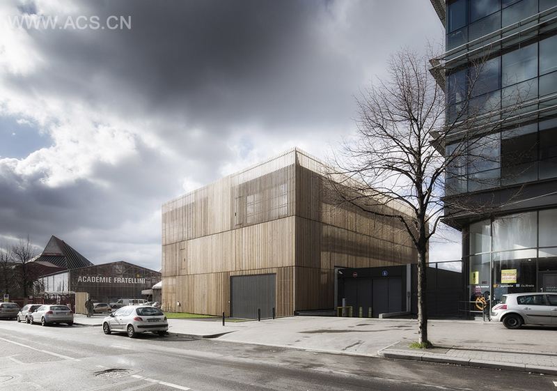 这个包括流动图书馆的档案馆坐落在城市铁轨的东侧,南临小公园。共三层高的大楼的主要功能为档案储存,木格栅外表皮为其塑造了统一完整造型,使之从环境脱颖而出,同时彰显出亲和力和环保态度。一层的大厅直达交通核心筒,为办公人员和访客提供快捷的交通流线,除了更衣室和功能室,一层还有一个移动车辆图书馆,这个区域的中心是一个大转盘,为停在上面的车辆提供旋转服务,帮助车辆在空间中转弯。整个二层几乎为完整的储藏档案空间,该空间的主要交通围绕核心筒进行。三层是办公区域,紧靠核心筒设置了一个方形的天井。