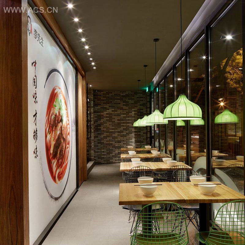 本项目坐落于北京崇文门,古鲁奇设计团段期待透过这家新形象店来述说李先生的这段历史,从中国到台湾,再去了美国,世界转了一圈最后回到中国。这段过程有如大时代的小故事,更是那个年代人生的缩影。空间上借鉴了的美国的汉堡店布局,装饰面材料又充满了中国语汇,期待透过这种碰撞给顾客提供独特有趣的用餐体验。