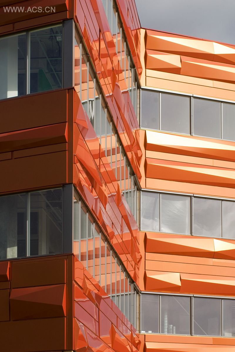 建筑不同寻常的几何形态造就了时刻变化的建筑外在。当人们由机动车道行驶而过时,这种多变性,不管是实体形态上还是阴影上,经由外立面吸收光线后产生的色彩和纹理的交错而变得愈发明显。