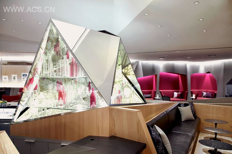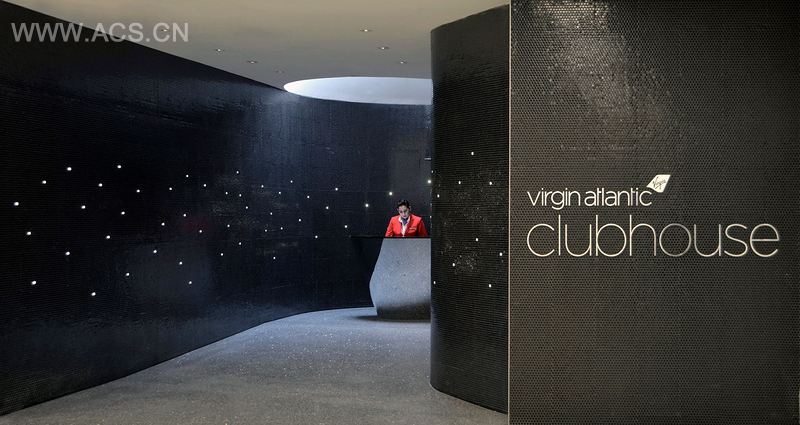 经过安全检查后,客人可以进入登机区的会所内。如同点点星光的小灯指引你进入雕刻版的入口通道。天窗透下的自然光照亮了如同反射镜般的接待台后面的接待员,这种入口序列,成为繁忙的航站楼和闲适奢华的会所室内空间之间的减压缓冲区,戏剧性地融入英国维珍大西洋航空贵宾休息室的体验中。
