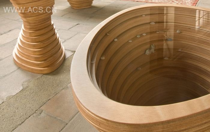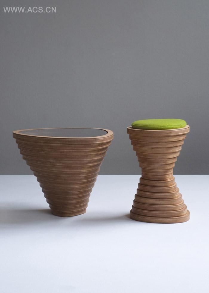 这是一系列将景观带入室内的家具设计。设计师从地球的构造,如山脉,峡谷等得到灵感,把这些景观抽象化,进行缩放,以适应室内家居设计的尺度,最后做出了这一系列又轻又小,联系室内与景观的家具。桌子由层层相叠的环状组合,顶部覆盖玻璃,内部清晰可见。凳子上面覆盖可移动的垫子。家具为手工制作,在荷兰生产。