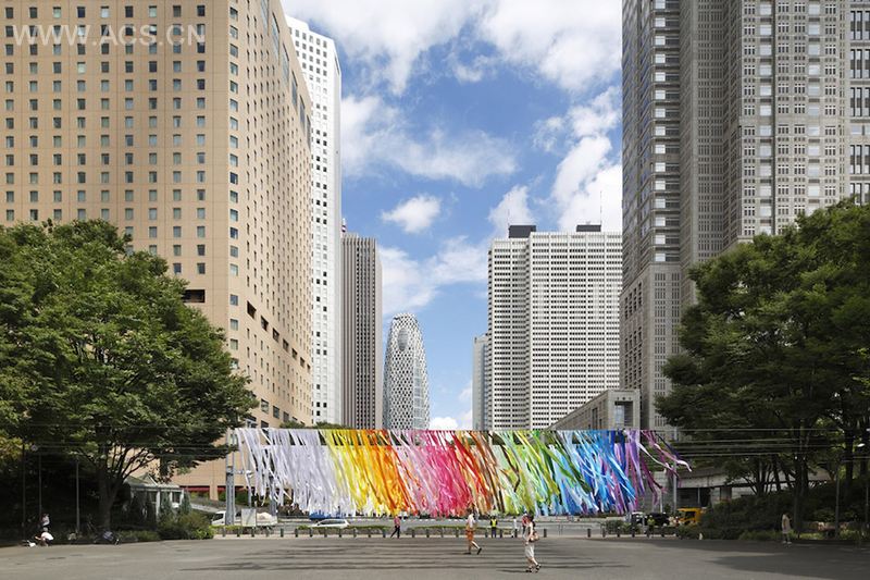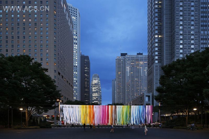 2014年夏季,东京工作室Emmanuelle Moureaux在新宿中央公园安装了一片全色彩艺术装置,该装置共使用到分别染上100种色彩的织物。这些手工染制织物随风而荡,在摩天大楼林立的新宿,在这个不一样的夏天,给人们带来了非凡的景象,飘逸的光影还有远离现实的想象空间。