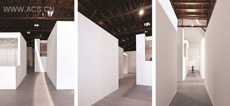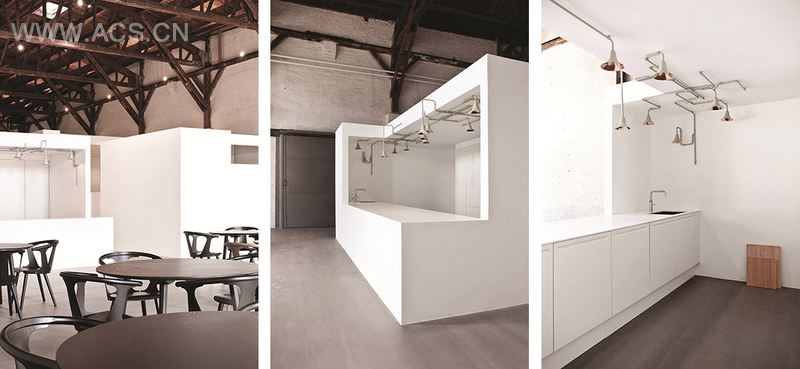 面积1600平方米的大仓库有着让人叹为观止的外露木屋顶,和光滑的树脂水泥磨砂完地面。十二个极简体营造出原始动人的空间,混乱中不乏亲密与惊喜。这一以村落为原型的设计能够承载城市公共空间中所发生的各种偶然与随机的行为。这些体有着相同的建筑语言和不同的尺寸与功能,因此有的像塔,有的有屋顶阳台,有的则是单纯的抽象雕塑。除了少部分盒体用作厨房,会议和储藏,大部分盒体都是灵活开放的功能艺术体。