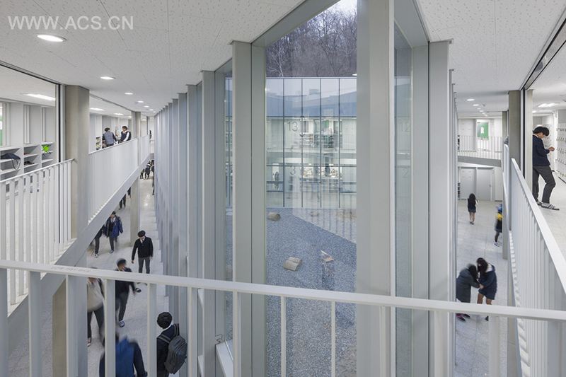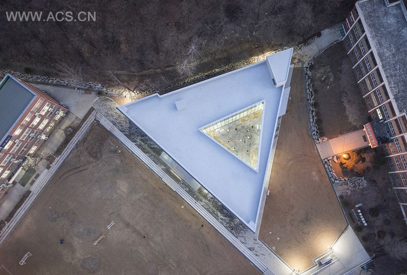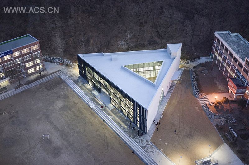 NAMELESS Architecture在韩国首尔附近的南扬州设计了一座“简单”的三角形型学校,期望用这种孕育“复杂”的“简单性”来探讨教育建筑新可能性。三角形的学校北边临着操场,西边临着教学楼,东边临着森林。周边环境各不相同。