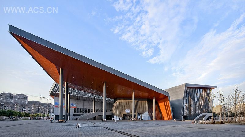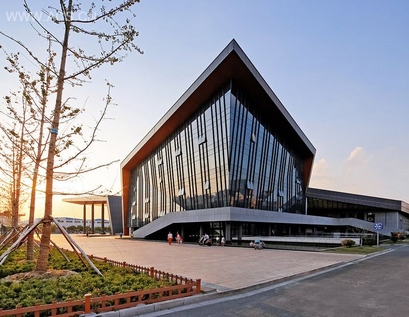 建筑表皮以深灰色铝镁锰屋顶、灰色毛面石材幕墙、半通透的丝网印刷玻璃幕墙,木色铝合金吊顶等现代材料,呼应黑、白、灰、木色为主的江南建筑色调,既立足当下又通过写意的方式表达对传统建筑与文脉的敬意。
