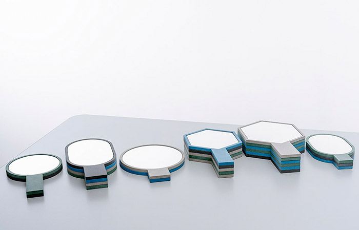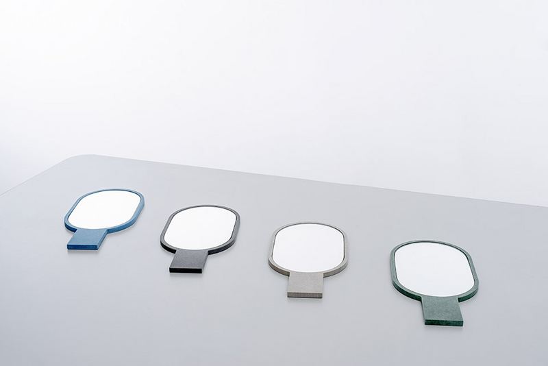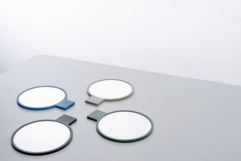 带把手的镜子。采用木纤维面板做框,三种造型每种两个尺寸,采用有机染料染上四种色彩:木炭,灰色,蓝色,绿色。加拿大魁北克蒙特利尔产。