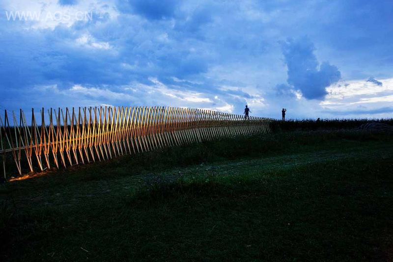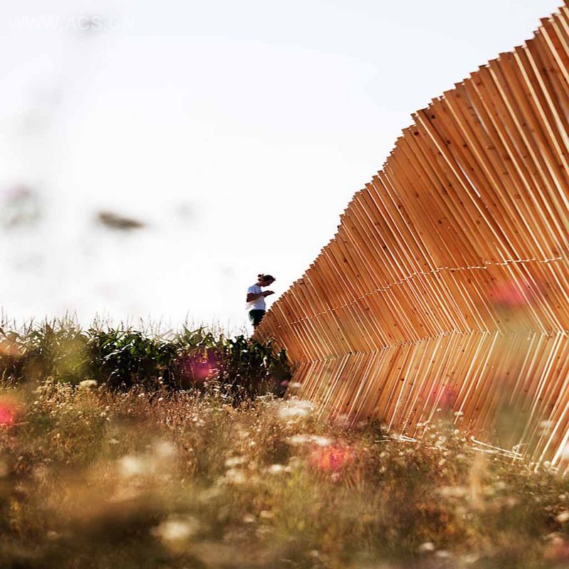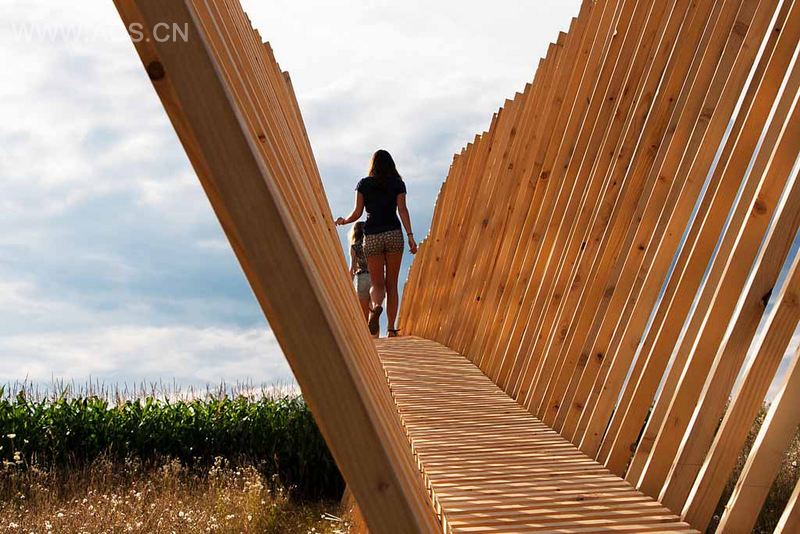 由匈牙利建筑师ákos Juhász 和 Dániel Eke指导建造的‘Corn-walk’ 是一条高架通道,从一块空地笔直通往玉米地。这座长40米的建筑按四根木头为一组拼成X型的方式搭建而成,并用平行木板在中间铺出一层坡道。从远处看,体验者站在通道的一端就像是突然从玉米地里浮起来一样。