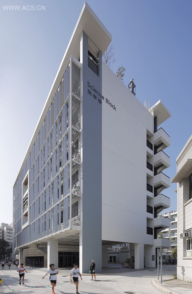 上层的十三个标准实验室由一个个的标准模块所组成,并坐拥菁葱的大球场景观。露台亦用作师生的休憩空间,其中两个模块更被挑空作为自然的通风口——大楼的呼吸空间(及用作师生的非正式交流空间)。