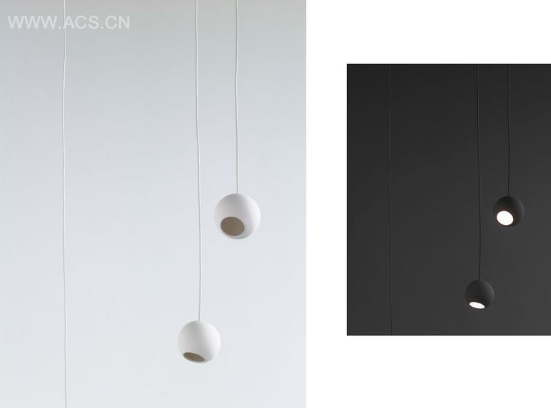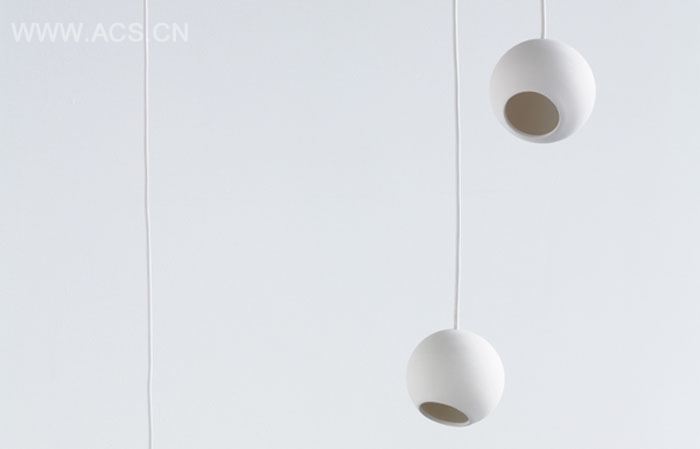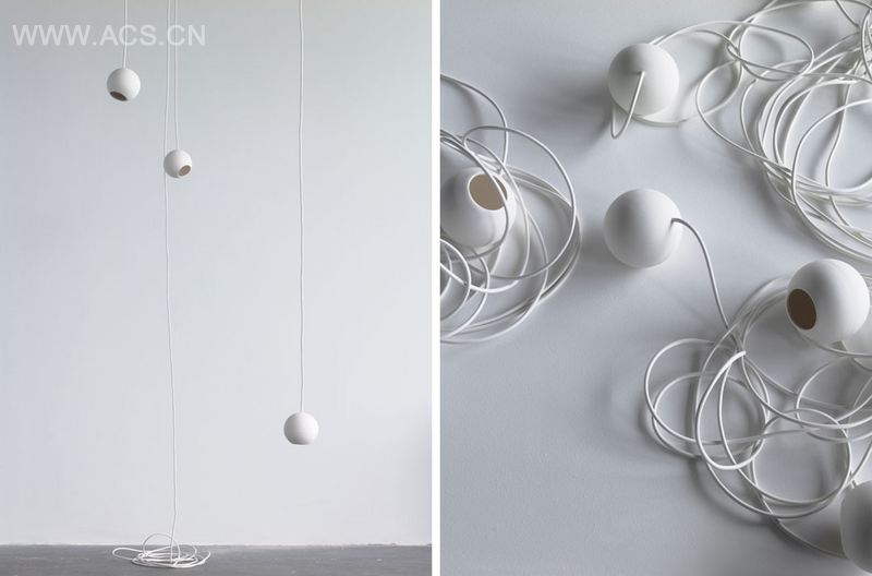 球形灯与大型钢反射件组合灯具。亚光陶瓷球形灯可以同类单独组合,也可以投向亮面金属反射器。可做吊灯,落地灯,桌灯,组合无穷。材料与光相互关系的探讨,在这个作品中亦有体现。