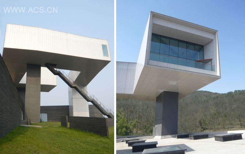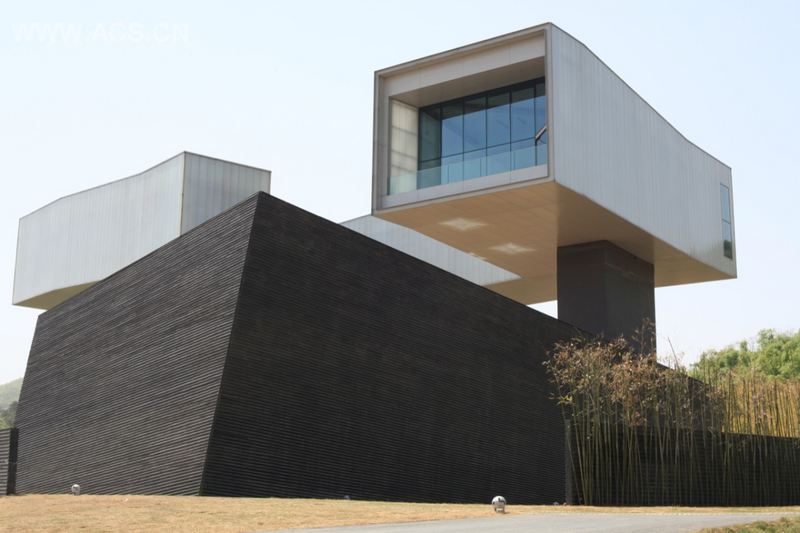 在悬浮空间和地面之间连接着一个大楼梯,具有强烈的雕塑感,从地面一直上到整个建筑群的高点,俯瞰整个湖畔建筑群。“博物馆由一片平行透视的空间和黑色的夯土院墙构成,其上漂浮着的是一个半透明的结构体。”最终建筑师选用了竹模板黑色混凝土和多层复合白色阳光板为主要外墙材料。