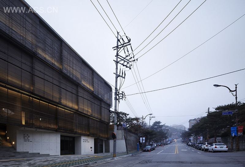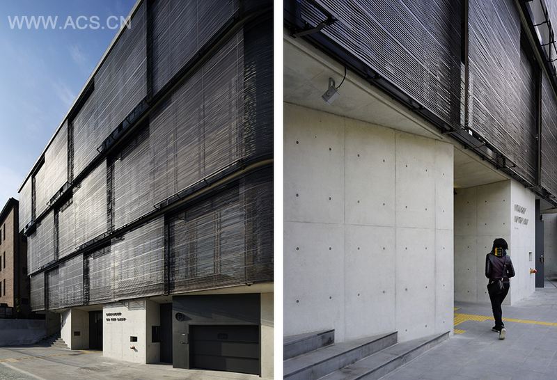 地处韩国北村的建筑临靠一个高差达到16米的坡崖。建筑师在底部沿街立面采用了韩国传统屏障"Bal","Bal"是将竹材切割并编制在一起,是控制光线以及阻隔视线的极佳材料,与展览机构主题不谋而合。人们从楼梯进入建筑,先到达一个相当原生态的垂直花园,这里仿佛山中河谷般粗犷自然。台阶越往上越狭窄。沿阶而上,首先到达的是一层的餐厅,在往上是二层的展区,三层则是与艺术家工作室以及办公场地,屋顶还有一个屋顶花园。整个路径在行径中体现了从城市到自然的过程,也为观众的体验揭开了第一道感官之门。