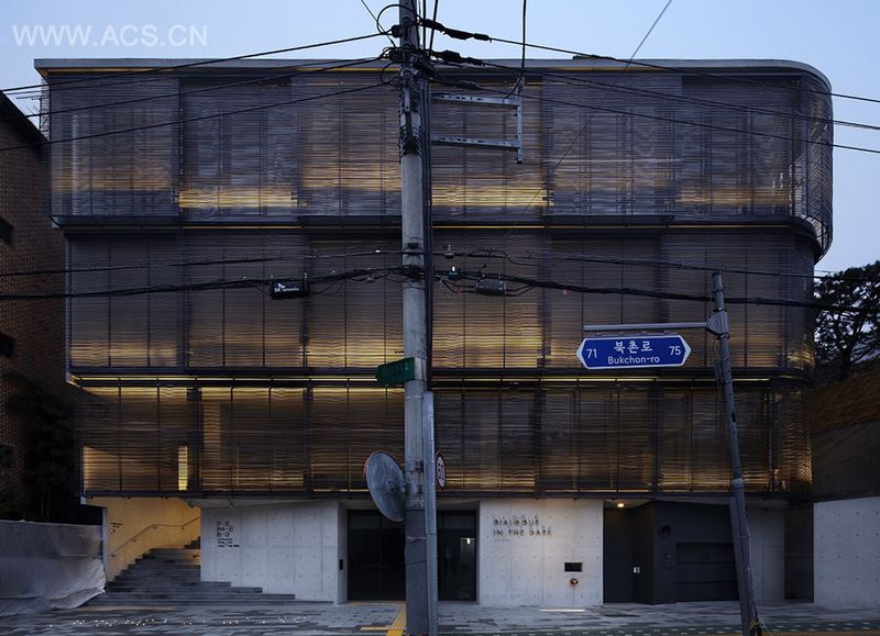 “北村--黑暗中的对话”是为韩国世界性的展览机构“黑暗中的对话”而设计。该展览机构希望游客能在与日常生活完全不同的黑暗环境中体会展览,在黑暗中关闭部分感官加强另外一部分感官的体验,当结束时每位游客能根据自身的经历和回忆描述体会。整个建筑的展览层在设计上对外几乎没有开窗。