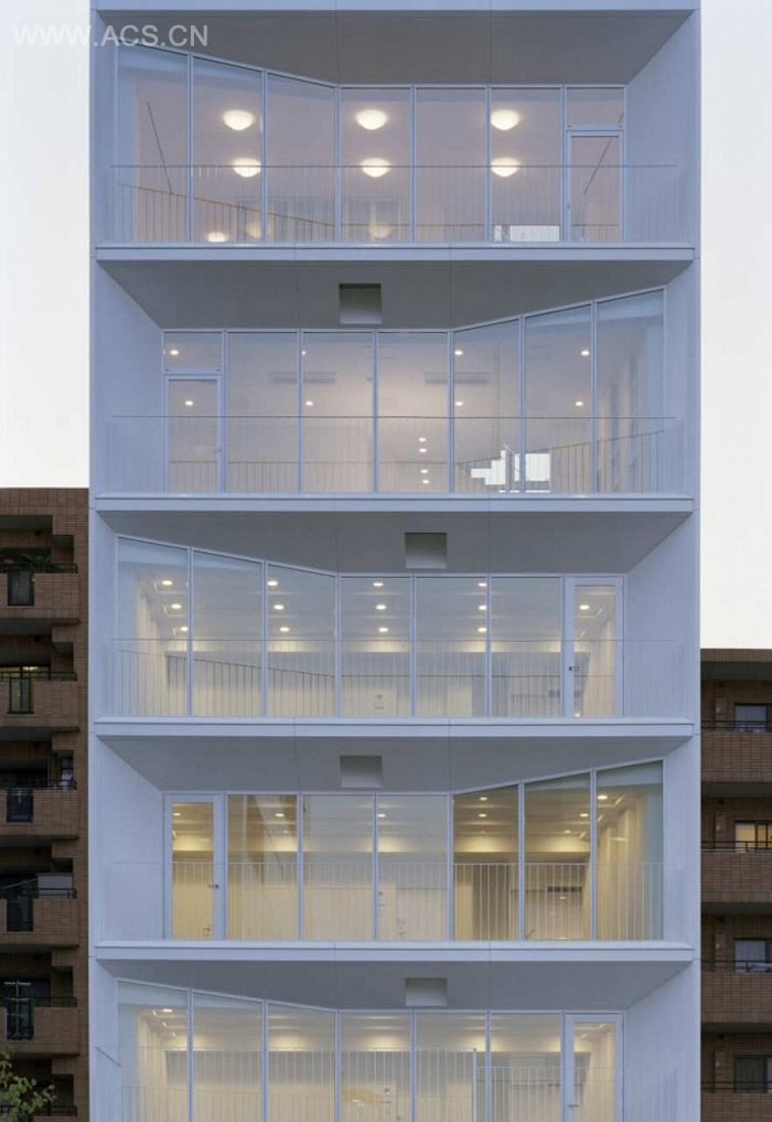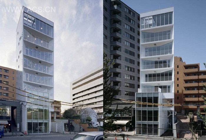 这栋醒目的白色塔楼位于东京涩谷的惠比寿,底层是商业,楼上是SOHO和公寓。每层都有阳台。通过室外疏散通道疏散。底面三层可以与上层完全分开使用。