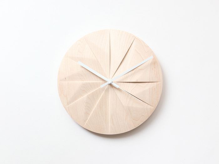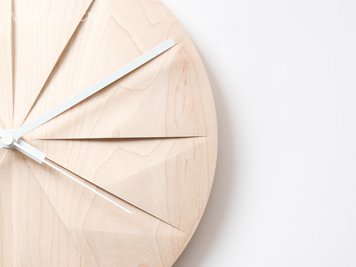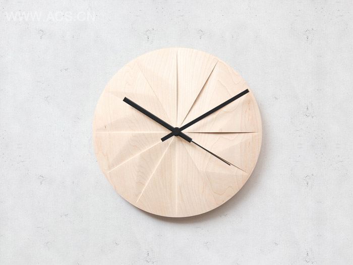 一款挂钟。表盘为木制,经雕刻形成美丽的光影刻度。