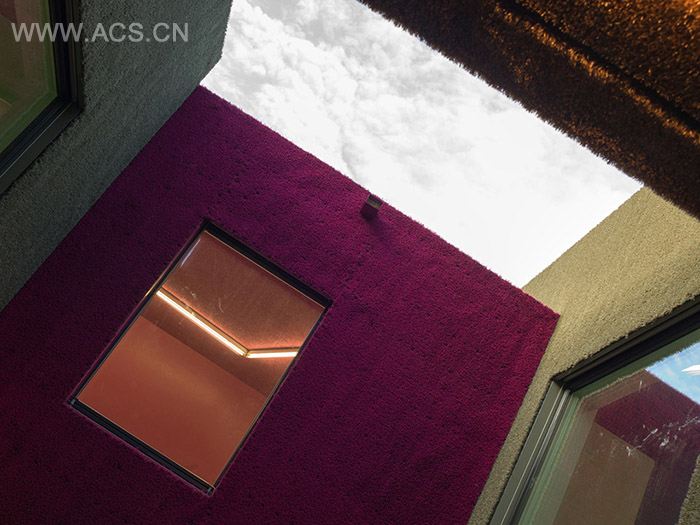 草黄色、红色和橄榄绿三种颜色的人工草坪形成了精致的立面,在乡村中心与周围环境形成