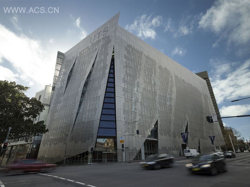 四块倾斜板将建筑体量包覆起来。铝质薄板上孔洞形成的图案源自“悉尼科技大学工程和信息技术学院”的二进制代码。表面“鱼鳃”状的突起结构打破