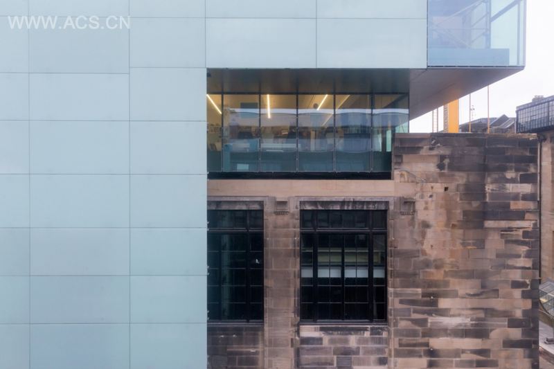 由斯蒂芬•霍尔事务所完成的Reid Building大楼与格拉斯哥设计学院主体大楼的建筑风格形成了一种“互补共生关系”,该校区主体建筑由英国本土建筑师查尔斯•雷尼•麦金托什于1897年设计完成,属简洁有力的新艺术运动风格。新建筑呈现的半透明形体与麦金托什厚重的石墙艺术形成强烈对比,轻的体量体现了在城市旧有结构下的校园建筑在艺术上特有的前瞻性。