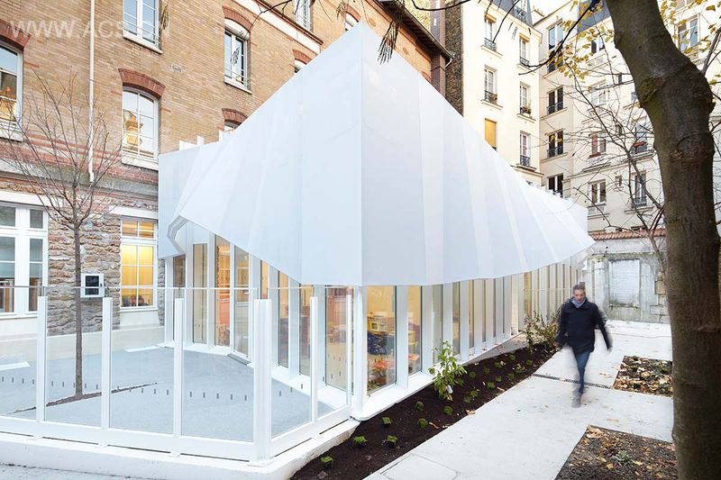 这次的扩建工程赋予了该托儿所与附近的建筑群重新建立新联系的契机,使其与庭院角落处现存的建筑形成强烈的对比。作为一个突出的、引人注目的项目,托儿所给人呈现出鲜明的视觉印象。该托儿所的屋顶很是特别,一顶透明的白色带孔屋顶为首层作为幼儿园空间和游乐场地的玻璃建筑遮风挡雨。