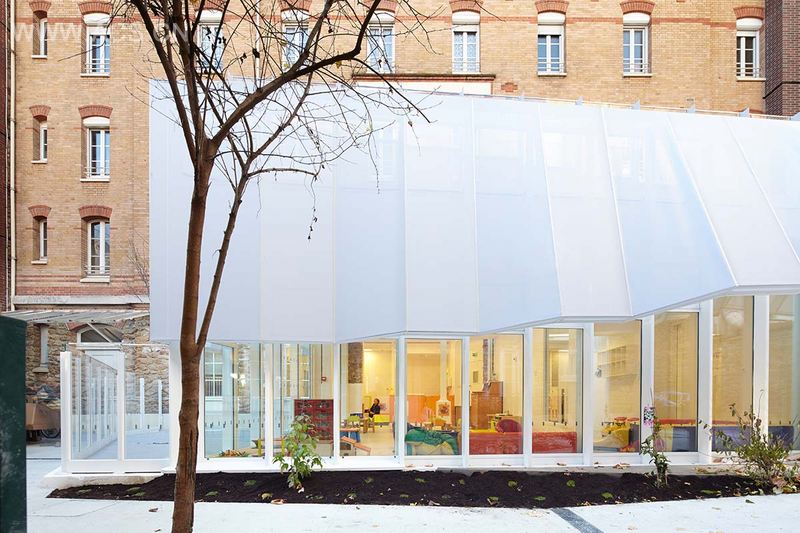 该托儿所共有三层,顶上的两层为孩子们服务,技术与私人空间则位于地下室。这种建筑布局是受英国庭院启发,庭院中还有种植园,环境非常优美。院中一个格架配置可以使攀援植物沿着它攀沿而上,直达顶端作为建筑外窗视觉保护的轻质帆布外层,给整个建筑形成一个绿色的透光的外观。