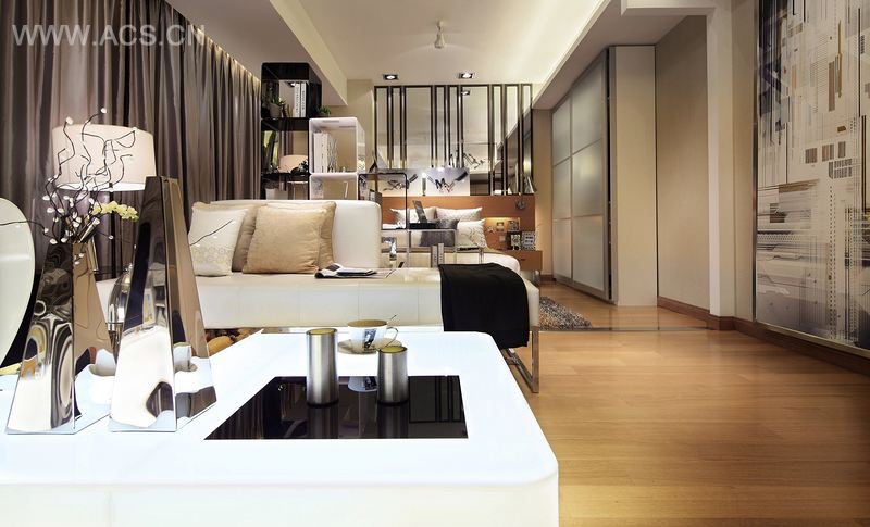 空间以白色,浅色,为主色调,黑色米色为辅色,对户型结构无过多繁复修饰,客厅卧室全开放空间,显得灵动富有时尚感,亚克力发光家具,几何形体储物隔断,创意十足的灯具,配饰贯穿整个设计,描绘出一个年轻,干净,时尚,简约,国际感的单身公寓空间。