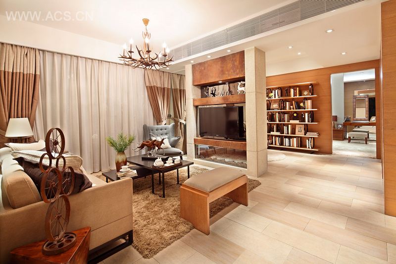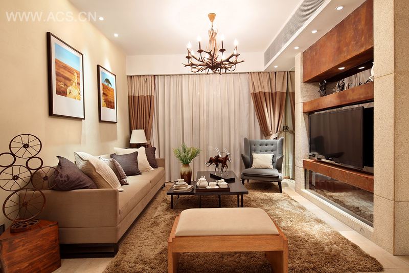软装方面以充满休闲度假气息的美国南加州风情为主调,定制油画以风景照为蓝本创作。巧妙的运用了实木、铁艺、锈蚀钢板、皮革、棉麻布艺、手工毯、仿岩石质感的地砖、定制相框、花艺等工艺的饰品,组合成温馨而又具自然感的视觉和触觉效果。