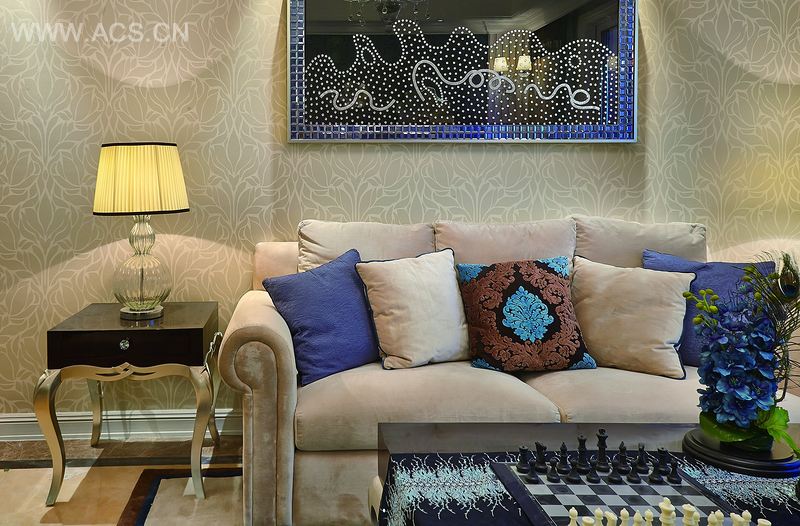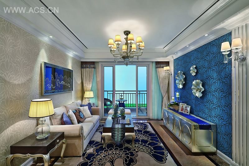 本案设计以蓝和米黄为主色调,以花和海洋为主题。多处室内装饰强调呼应了主题。电视墙、地毯、壁画、抱枕、餐具和桌椅等等对主题都有所体现。美轮美奂的吊灯、桌灯则强调其空间感和整体感,合理划分室内空间的功能性。