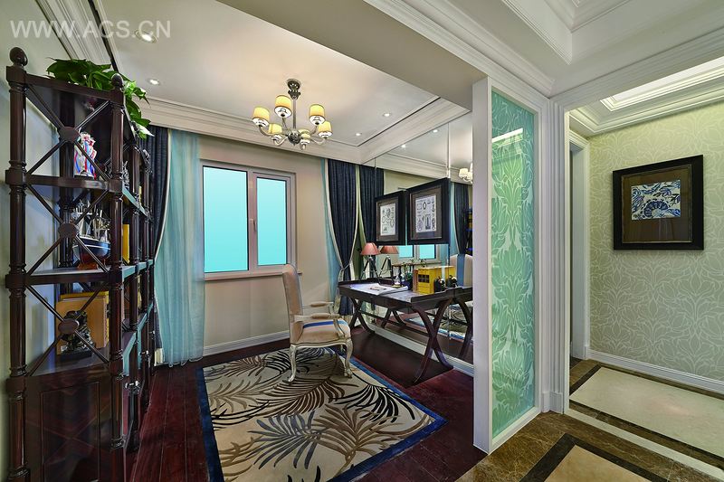 从餐厅延伸过去是书房,以木头为主要材料,强调其大气稳重的文化氛围。儿童房和主房则各有其味道和趣味。