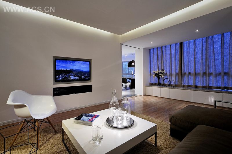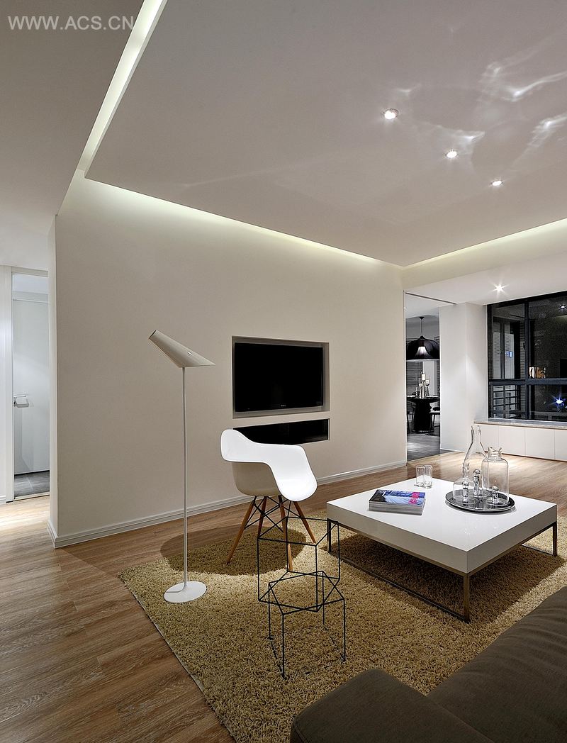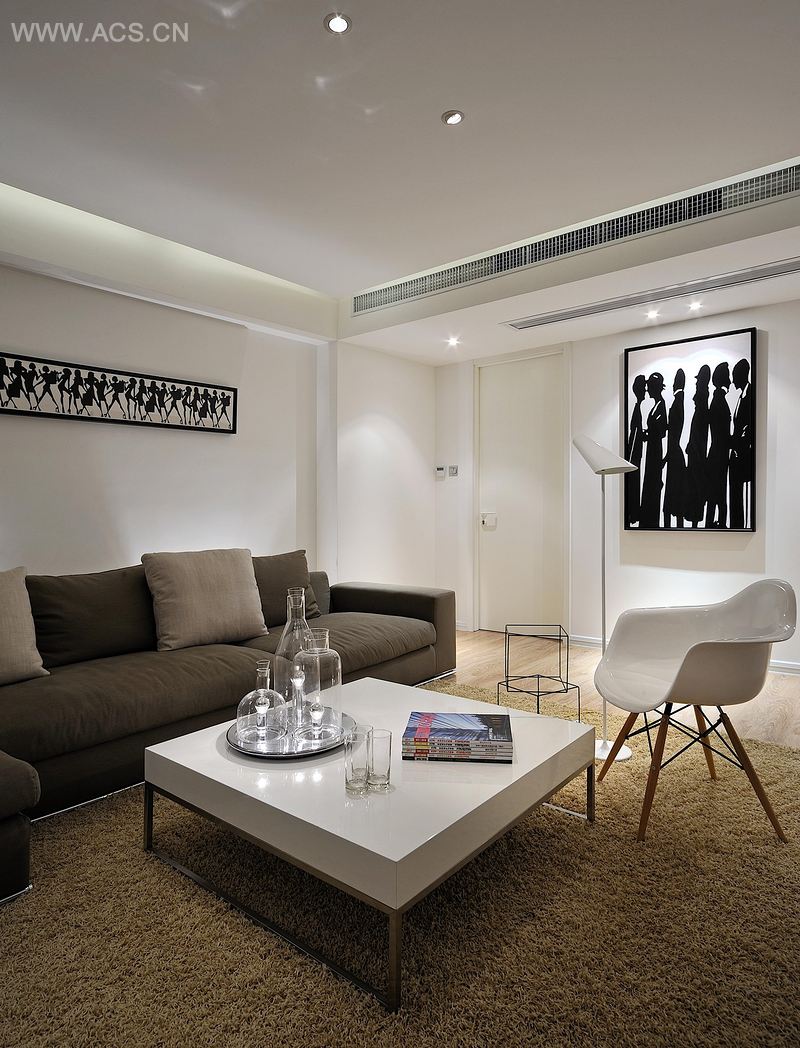 “大道至简,为画者善于留白。”本案设计一切从简出发,保留原始的空间的结构,没有过多的装饰。以中轴线分空间,通过灯光把空间做出明暗层次,利用阴阳角的收口将墙面和吊顶完美地融进空间结构。在色彩搭配上,公共空间以黑白为主色调,咖啡色家具协调空间黑白的关系;卧室部分以暖色调为主,使得空间兼具连贯性和延伸性。餐厅处黑色的吊灯和餐桌完美地融合在一起,使得空间中黑白的对比更加有层次。
