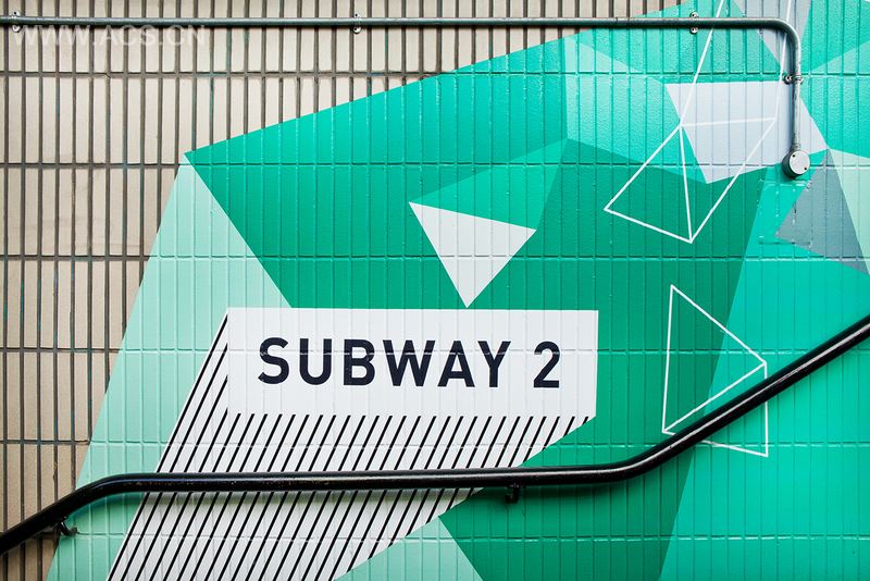 We devised a wayfinding system to help travellers navigate the underground tunnels. Here, colour was wrapped from floor, to wall, to ceiling, giving each tunnel a distinct identity.
