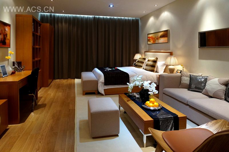 本案应甲方要求,设计风格以20-30岁年轻人喜欢的时尚科技感为主,如何将小空间利用率最大化是我们此套样板房所追求的理念,将硬装设计的颜色、照明、原材料简化到最少的程度,同时对材料的质感要求非常之高,空间处理上是在尽量满足功能的同时也使空间使用最大化,做到物尽其用,同时,本套样板房面积不大,仅为37平方米,为时下年轻人消费居多的小户型,年轻有个性的设计也是我们想要达到的效果。为了消除此户型过小带来的压抑,在功能布局上采用了开放式和半开放式相结合的手法来划分区域。在一个房间中可能包括起居、会客、烹饪、储存、学习等多种功能活动,整个空间各区域间一览无余,彼此呼应,弥漫温馨。开放式的厨房、客厅相融在一起,任清泉先生更是以一贯的细腻心思开辟了一个供读书写字的小书房,卧室与开放的书房相呼应,空间的交流体现出任老师对生活的态度,将整套户型的线条明朗化却又有丝丝相扣般的和谐。整个户型色彩基调以暖色为主,淡雅浪漫,给人感觉干净、明快,再配上线条简洁的家具,流露出一份时尚优雅的气质。客厅点缀的银色亮片靠垫为整个空间增加些许时尚感,和谐中也凸显了现代人对生活品味与情调的追求。