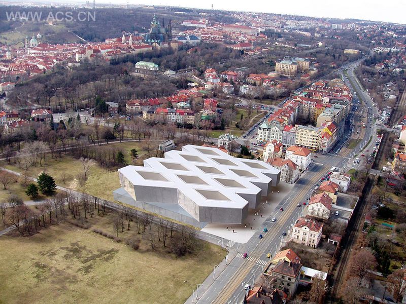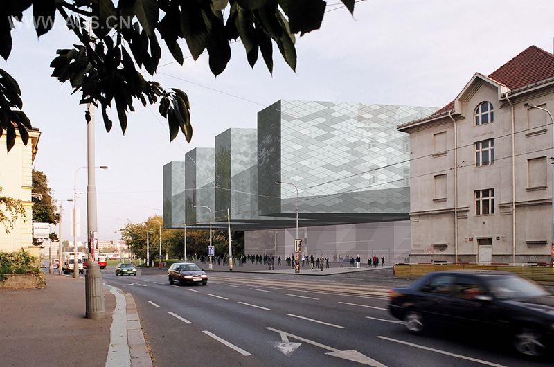 加内力建筑事务所在捷克国家图书馆的参赛方案由两大功能体块形成;书库和办公空间组合成为的整体的质量,轻盈的坐落在开放而透明的公共空间。‘网格’形态的主体作为藏书和库存管理,而透明的第一层空间为来访者提供了非常通透的公共功能。这种空间处理方式优化了整座建筑的能源消耗的性能,网格形态的大体积能够保持建筑内部整年的稳定温度,从而避免了任何的暖气和冷气的能源消耗。