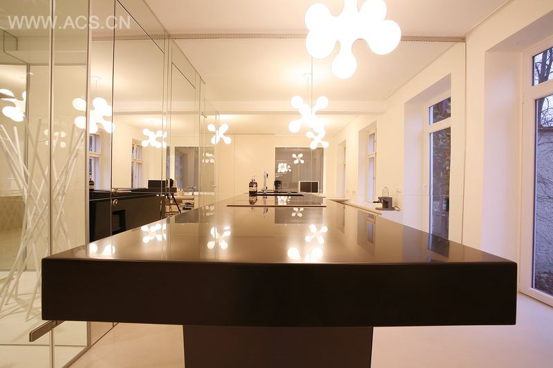 家具和灯光设备的特殊选择营造一种非常特别的氛围。一张厨台用来充当工作和交谈的直立书桌,同时还有设计师制造的餐具柜。桌子用石棉水泥板制成, Eoos工作室设计的沙发可用来休息或坐下思考,还配有得过奖的万德诺座椅,使整个办公空间更完美。