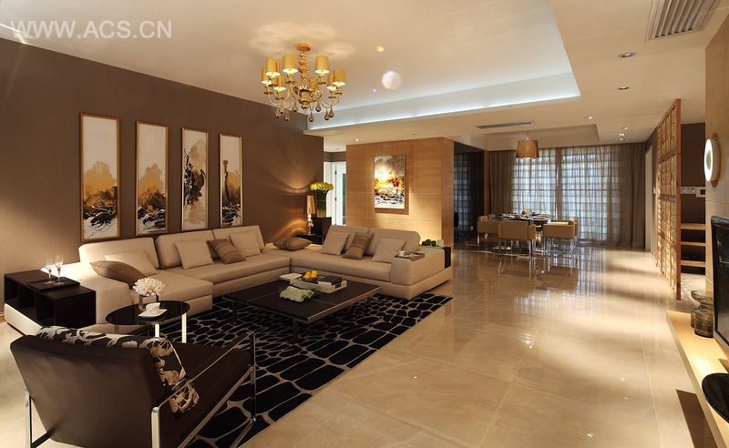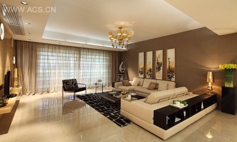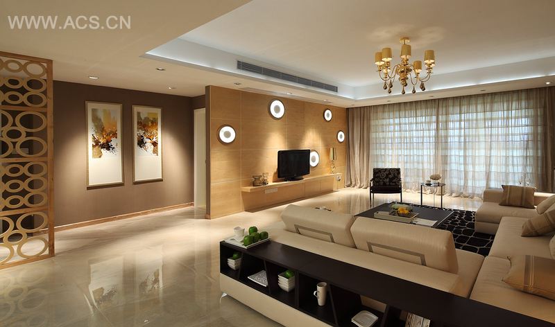 本案以米黄为主色调,营造一种舒适的家居氛围。简单的布局配以米色的沙发、浅灰的半透明窗帘以及浅黄色的背景墙和屏风,散发一种淡淡的优雅。沙发背后是简约的储物柜。设计师在配饰上也很下功夫,电视墙上浮动的圆圈,演变成屏风上的圆圈,中间墙上的挂画是两件式,对面墙上则有四件式的挂画,都安排得恰如其分,有与之呼应处。