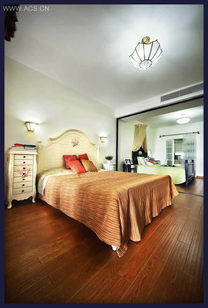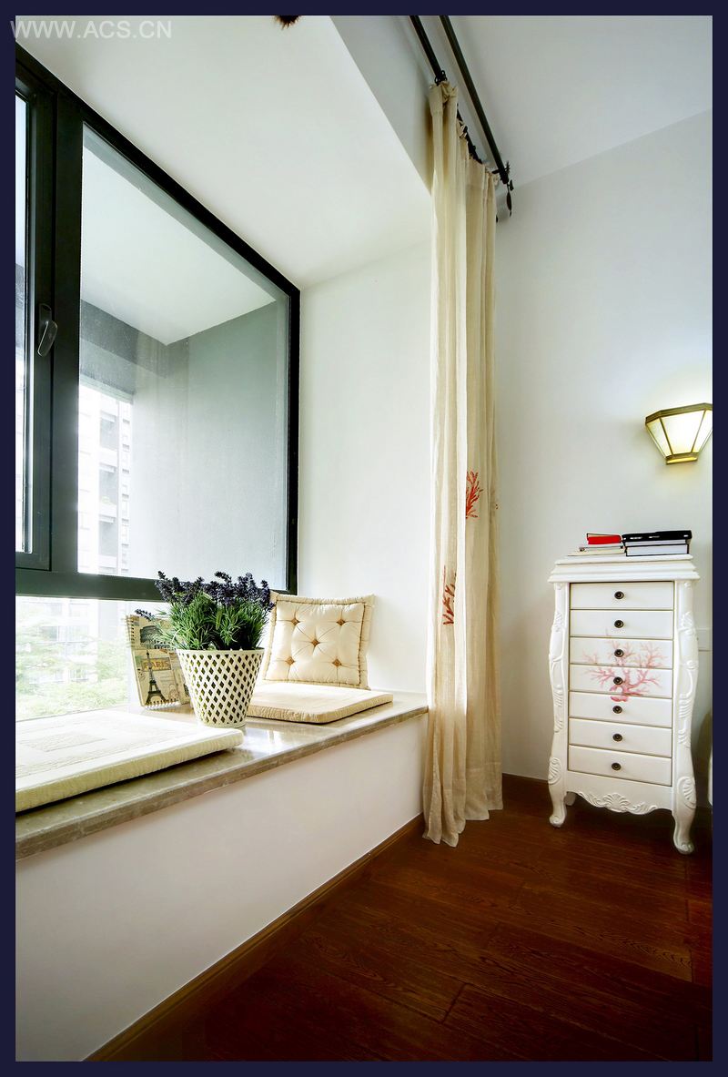 本案以地中海风格特色的风景图片作为墙面背景,强化地中海风格,同时使狭小的空间,在视觉上变得开阔,且风景宜人。