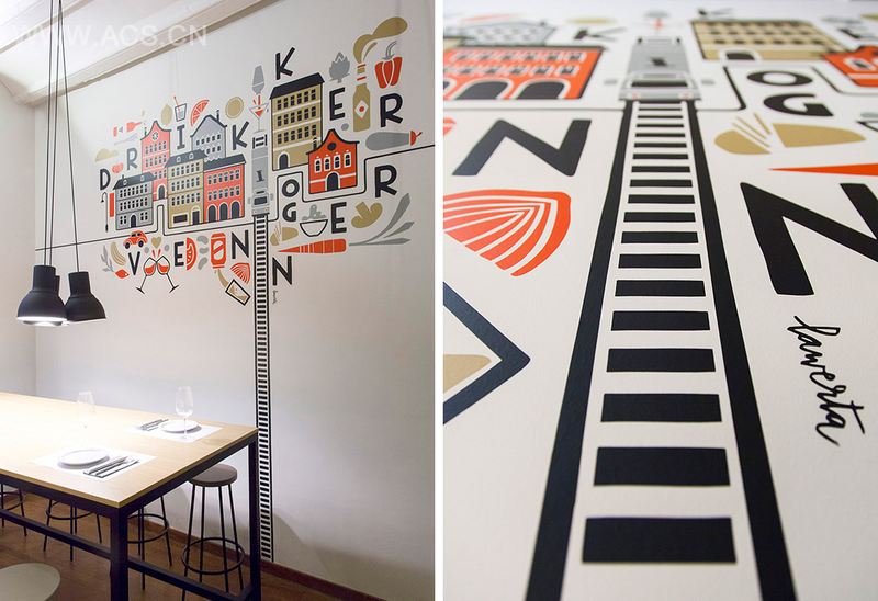 我们在酒吧墙壁上发现了巴伦西亚艺术家Lawerta的插画作品“Drikker og venner”。这是一幅北欧城市的简画,带有艺术气息的纯手工笔触让整个空间充满色彩和温馨。一张高高的桌子让我们仿佛置身于传统食堂,桌子前面则是酒吧区。各式各样的高桌填满了空间,似乎也在追寻着酒吧的无限活力。