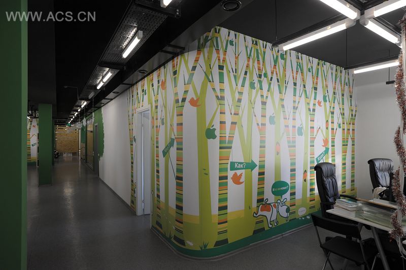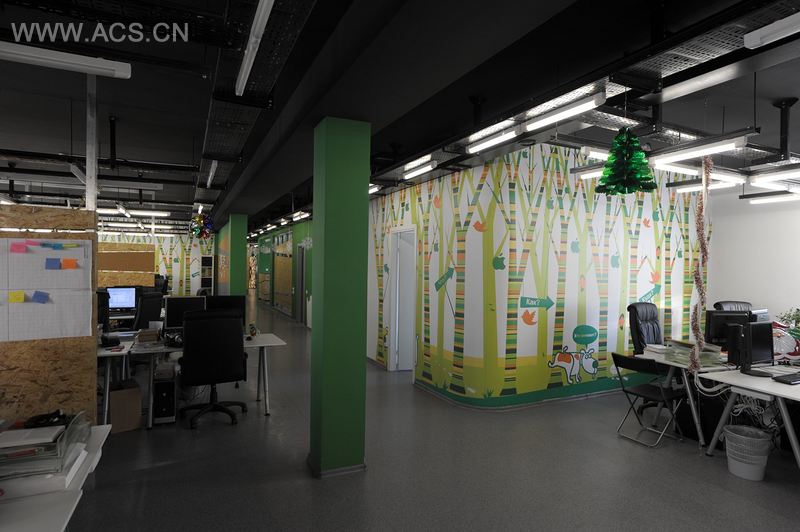 宽敞的办公室划分出一些功能处所:前厅、工作区、三个长途电话间和两个休息区。室内风格以生态极简主义为特征,布景采用自然遮盖物:树木、刨花、泥土色标度、树木图片。基本色调是绿色——公司的风格,展现出“花园”的理念。墙上的色彩以花园为主题:树丛、动物和鸟。前厅的管理人员货物架有刨花木板制成,工作场所由圆形固定装置进行照明,地板和墙体上印有设计好的公司商标。