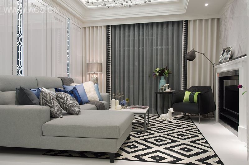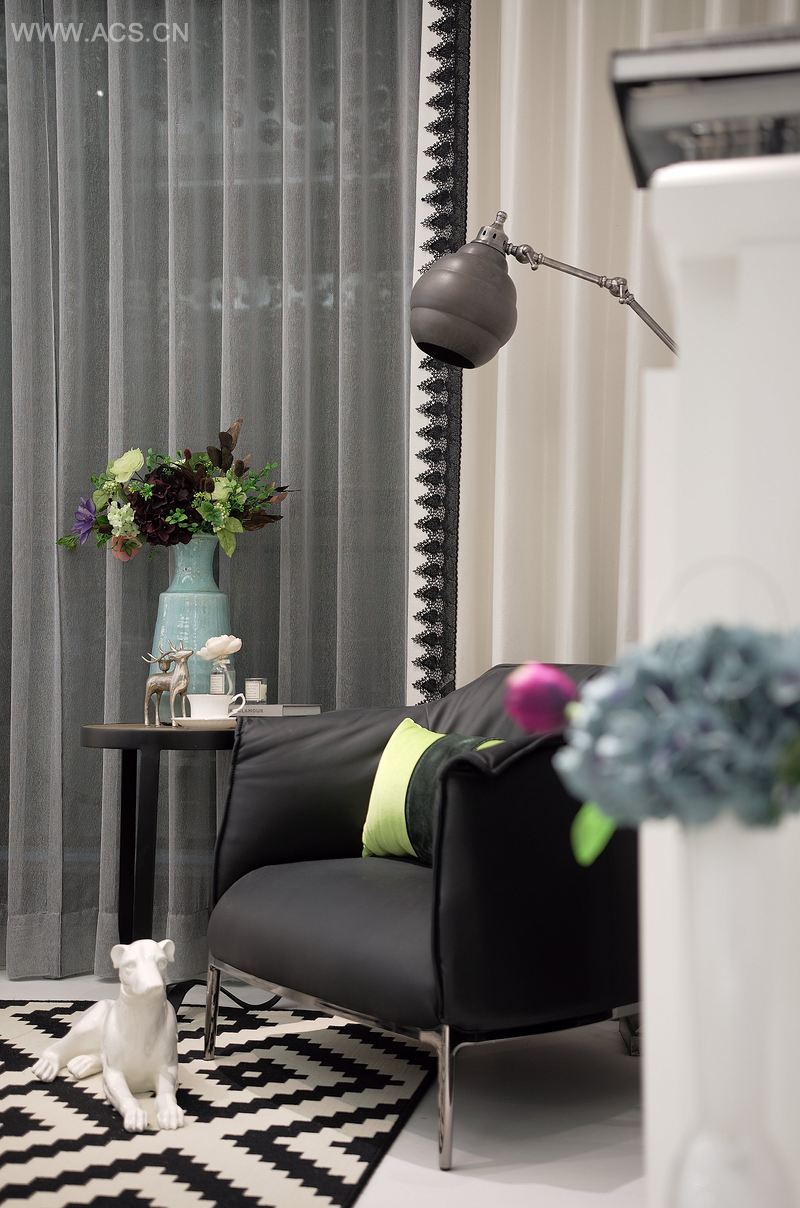 如客厅置入长型缎灰沙发,略带光泽感的绒布面摆置花样不一的抱枕,不规则的花样走线,以及浅灰、米白、亮蓝等大胆选色,使得空间生机勃勃,也和餐厅的草绿餐椅遥相呼应。一反常态,主卧采黑白时尚风格,古典花纹壁纸与床枕被褥一气呵成,朦胧感的纱幕、隽黑窗帘、深色毛皮地毯等视觉元素,既营造出色彩的丰富层次,也标志着主卧的特出地位;次卧则回归主轴,以湛蓝与纯白为基底,配合未加雕饰的床板与壁面,唯窗帘边缘藏匿些许图样,犹如一颗隐隐跃动的童心,于简练的空间底蕴里,引带出英伦新风的堂皇生机。