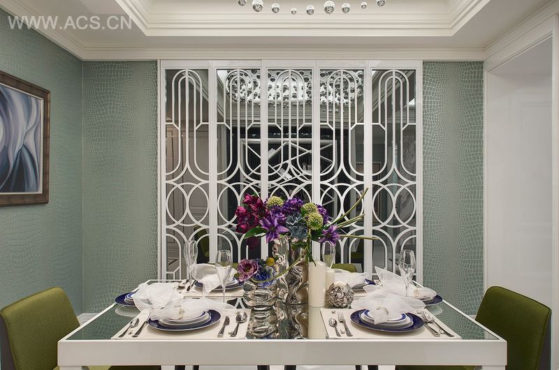 步入室内,设计者取消客餐厅隔阂,并使用一贯清浅色调铺就空间,亮银、湖水绿与米白色一路延展,使天花与壁面相互呼应,如一张素朴画布,亟待屋主的巧手点染。大串银珠垂降半空,彷佛散落银河里的斑斓星座,被神祇一分为二,成为串连客/餐厅的有利工具,随着步履轻移,可见餐厅之流线窗花,与客厅墙面与镶嵌纹理互有呼应,设计者选以利落光滑的镜面材质,于收放间堆栈视觉,使空间深蕴着古典天文学的神秘,亦在轻透湛亮底,展现当代艺术的高度创意。