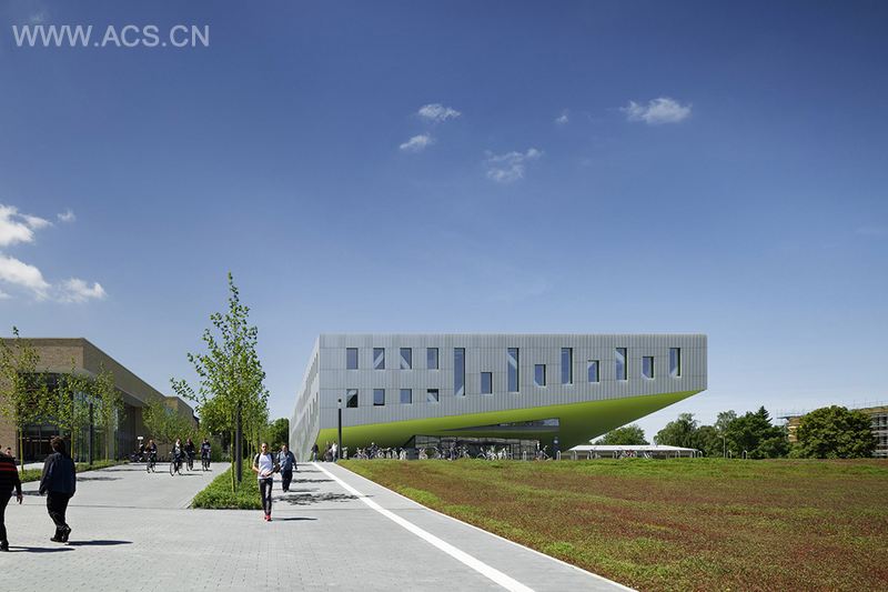 鉴于该建筑所处的位置及“纽带”功能,建筑师将大楼设计成带剖面底层的三层体量。切口构造与外部区域建立了紧密的联系,同时成为大学建筑清晰、辨识度高的入口—一座特色鲜明的建筑由此产生。此外,精心设计的外部区域可以用来举办活动和会议。